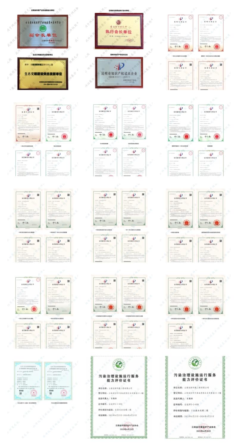 公司持有環(huán)保工程專業(yè)承包二級、市政公用工程總承包三級、建筑工程總承包三級、污染治理乙級、污染治理設(shè)施運行服務(wù)二級資質(zhì)證書。前后獲得“十二五”生態(tài)文明建設(shè)突出貢獻單位、云南省省級成長型中小企業(yè)、云南省知識產(chǎn)權(quán)優(yōu)勢企業(yè)、云南省科技型中小企業(yè)、云南省專精特新中小企業(yè)、招商蛇口最佳合作伙伴、中交置業(yè)友好合作方獎等榮譽。